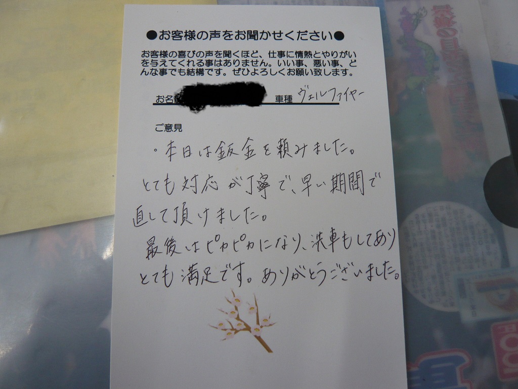 ご利用ありがとうがざいました。Fバンパー修理、塗装、価格18900円の作業内容でした。また何か困ったことがありましたらぜひお願い致します。
